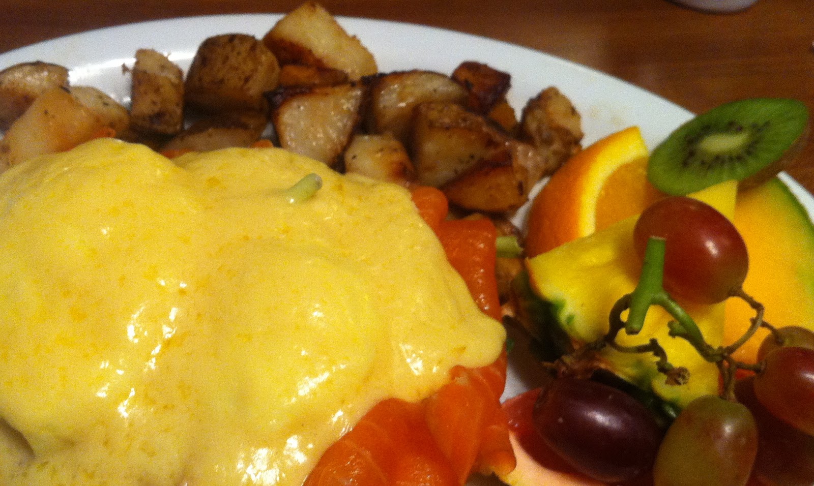 I wasn't in the mood for too much adventure so I went with the salmon poach which is basically a salmon eggs benedict but on a toasted slice of rye bread rather than an english muffin, served with home fries and fruit. The home fries are always very well cooked here, love them crispy and crunchy.